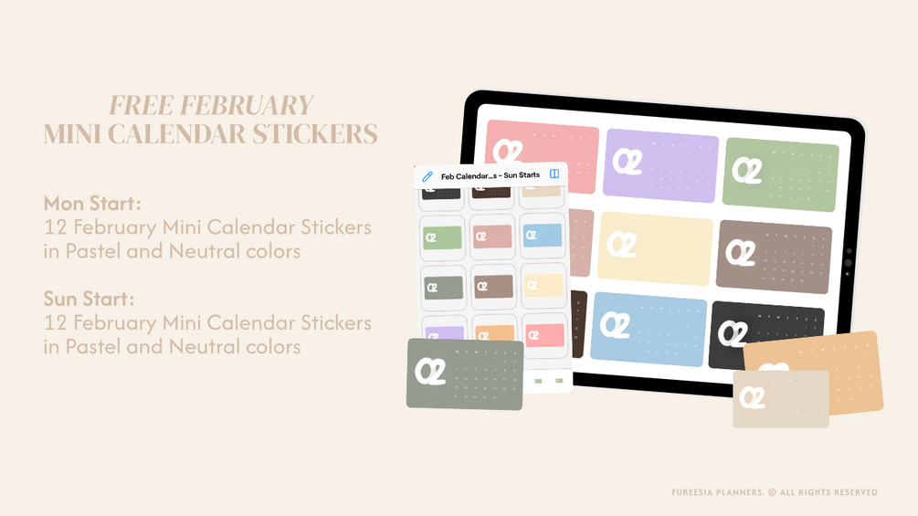 Plan your month with these beautifully designed February Mini Calendar Stickers! Available in both Monday Start and Sunday Start formats, this set includes 12 designs in pastel and neutral tones.